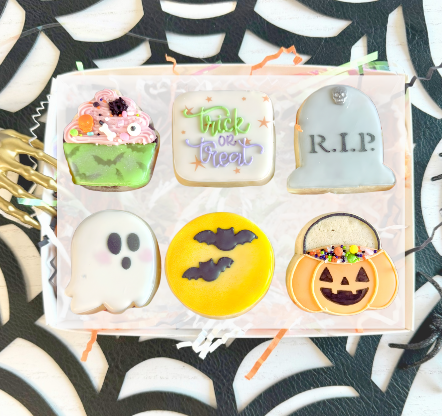 6pc Gift box: 6x2.25" mini cookies in 5x7 white box with clear top, crinkle paper and coordinating bow and tag